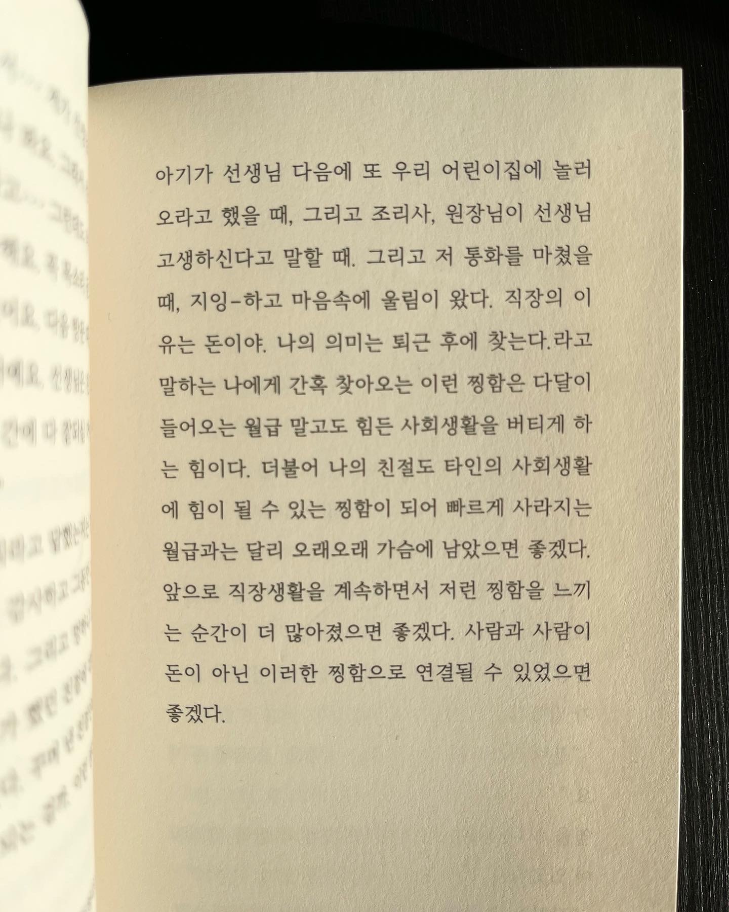 이 책을 쓰는 동안 '사내 괴롭힘' 사건으로 청소 노동자가 사망했고 대기업에서 사내 괴롭힘이 심각한 수준으로 나타났다는 기사를 보았다. 내가 사는 꽃밭에서 꽃밭이 아닌 세상을 바라보는 것은 이질적이고 고통스러웠다. 내가 꽃밭에 있는 글을 쓰면 아닌 사람들에 대한 조롱이 되는 것은 아닐까 고민하다 동료들 같은 사람과 오래오래 일하고 싶다는 마음, 이런 사람들이 많아지면 세상이 좀 더 좋아질 수 있겠다는 마음으로 이 책을 썼다. 나는 사람들 개개인은 악하지만, 사람이 모여 사는 사회는 느리더라도 올바른 방향으로 흐르기 마련이라고 생각한다. 내가 앉아있는 이 꽃밭의 구역을 넓혀가고 싶다는 생각으로 이 책을 썼다. (189pg 에필로그 중)