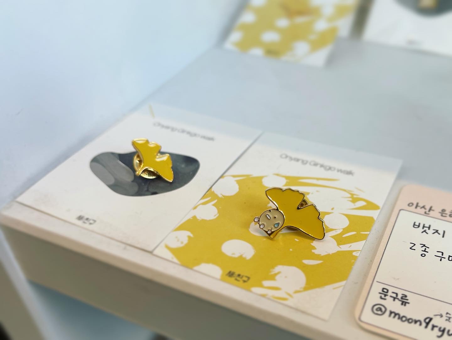 아산 은행나무길을 상징으로 만들어진 은행나뭇잎 굿즈입니다. 이 뱃지가 다 팔리기 전까지 책방은 가을입니다...ㅎ