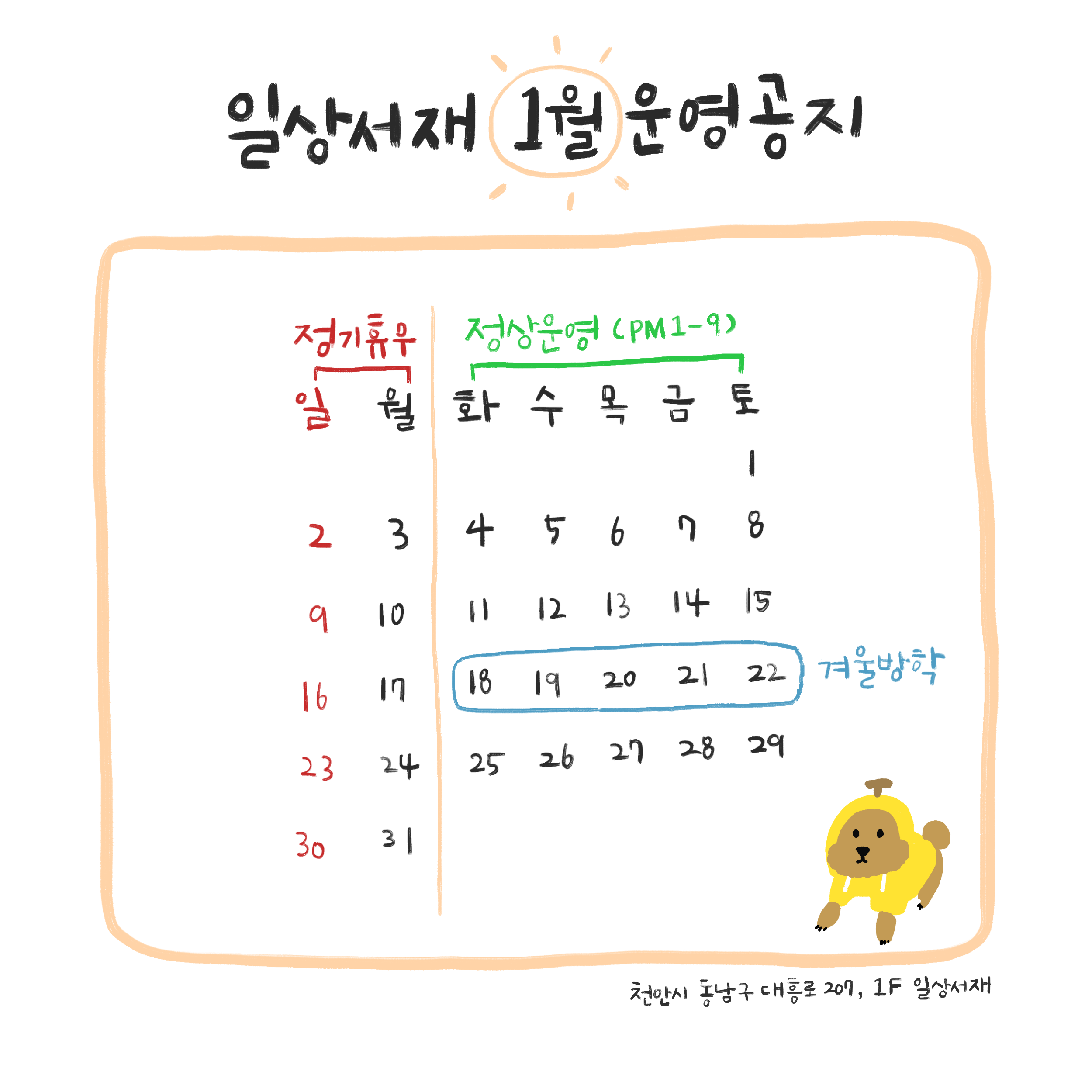 올해도 책방은 정기휴무와 운영시간의 변동 없이