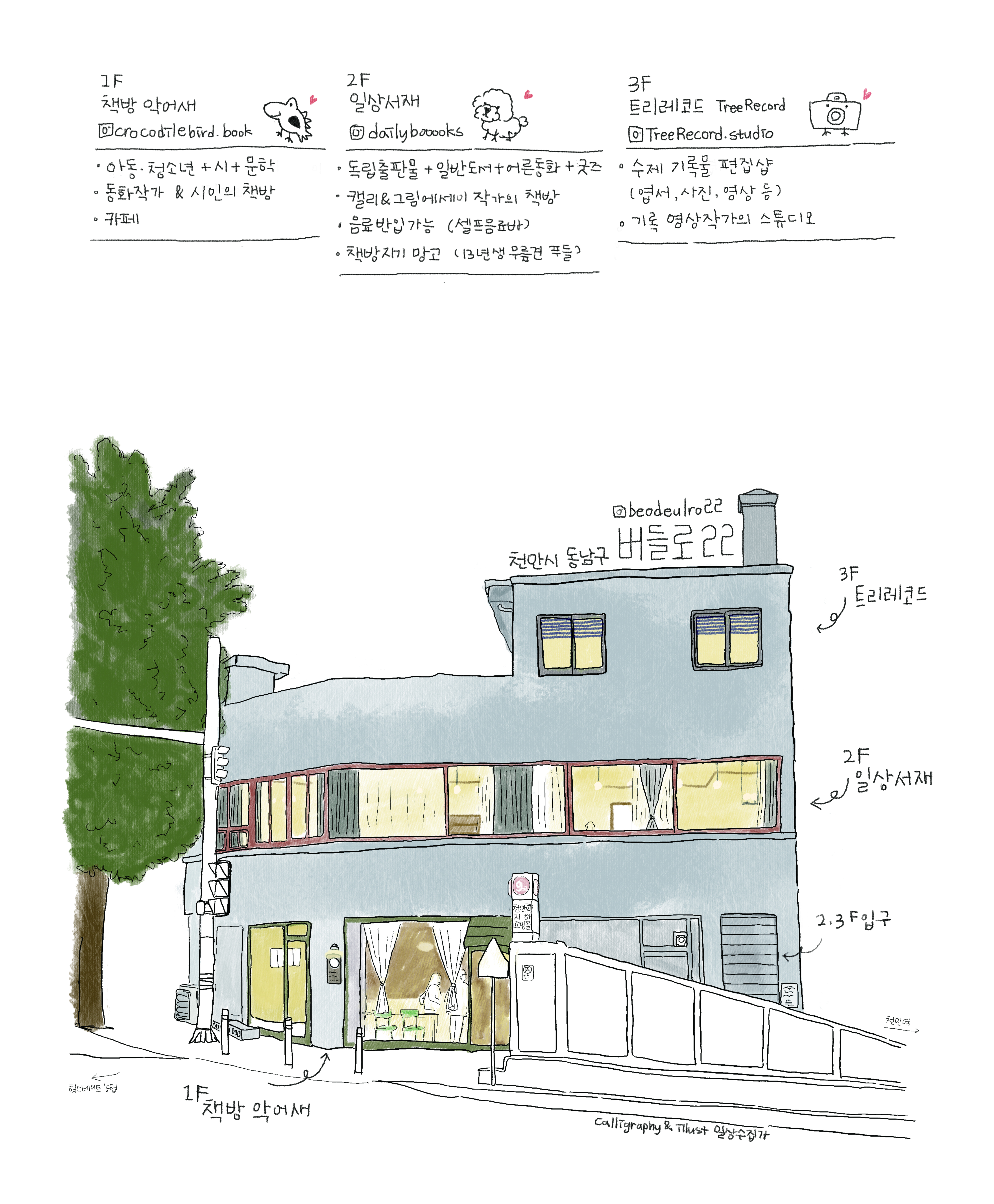 공간 1층에는 동화 작가님과 시인이 함께 운영하는 책방 악어새가 함께 운영되고 있구요,