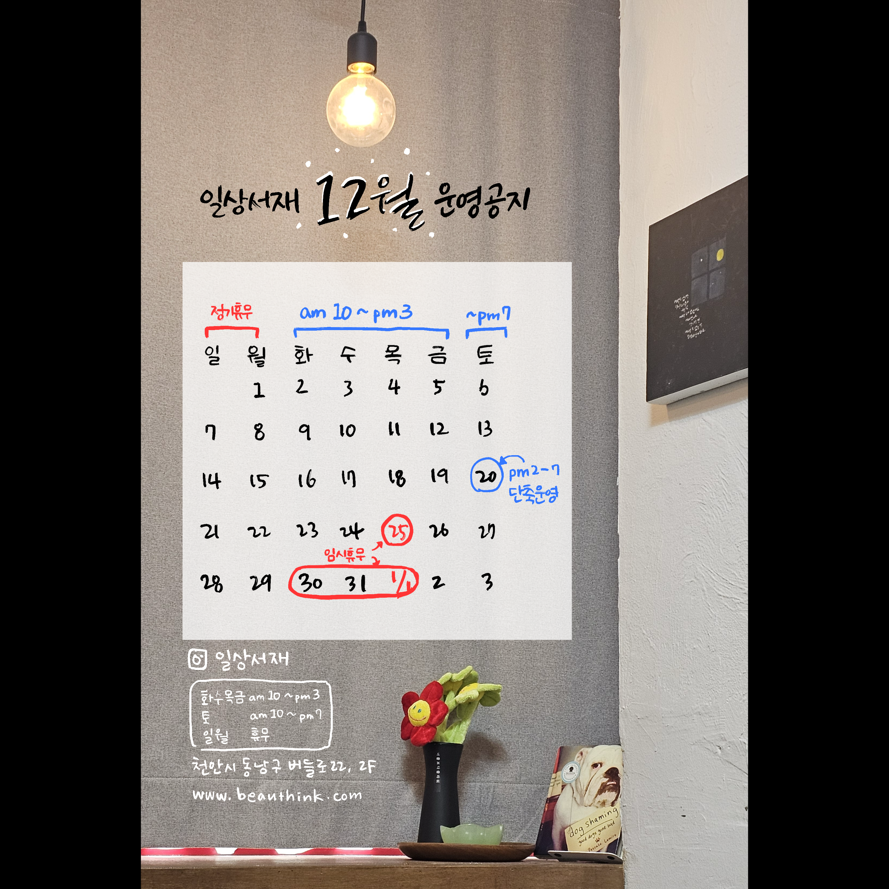 올해 12월들어 1년만에 ^^; 책방 운영시간을 변경했습니다.