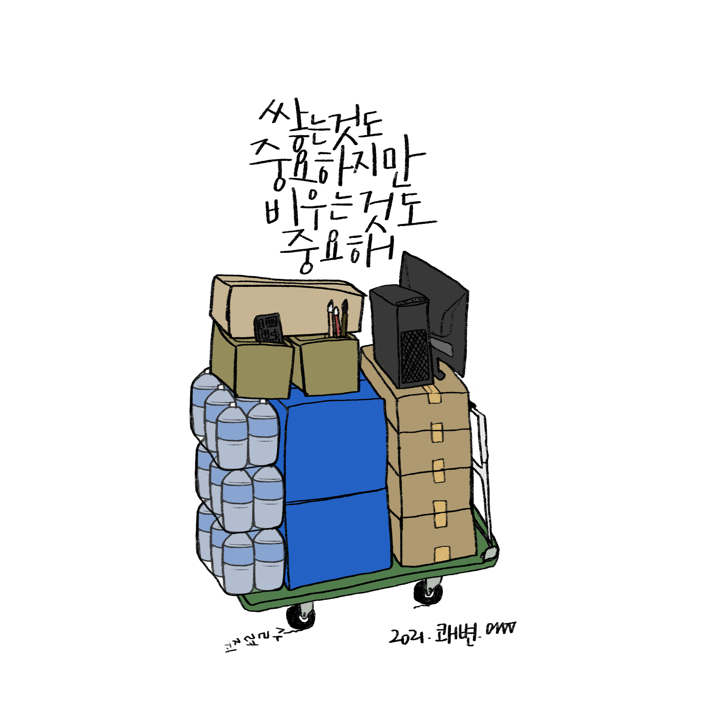 일상수집가/Artwork 쾌변 일상수집가 2021. 2. 17. 18:29 쌓는 것도 중요하지만 비우는 것도 중요해 뱃속에도머릿속에도방안에도숙변들이 가득해가벼워지고 싶어건강하고 싶고