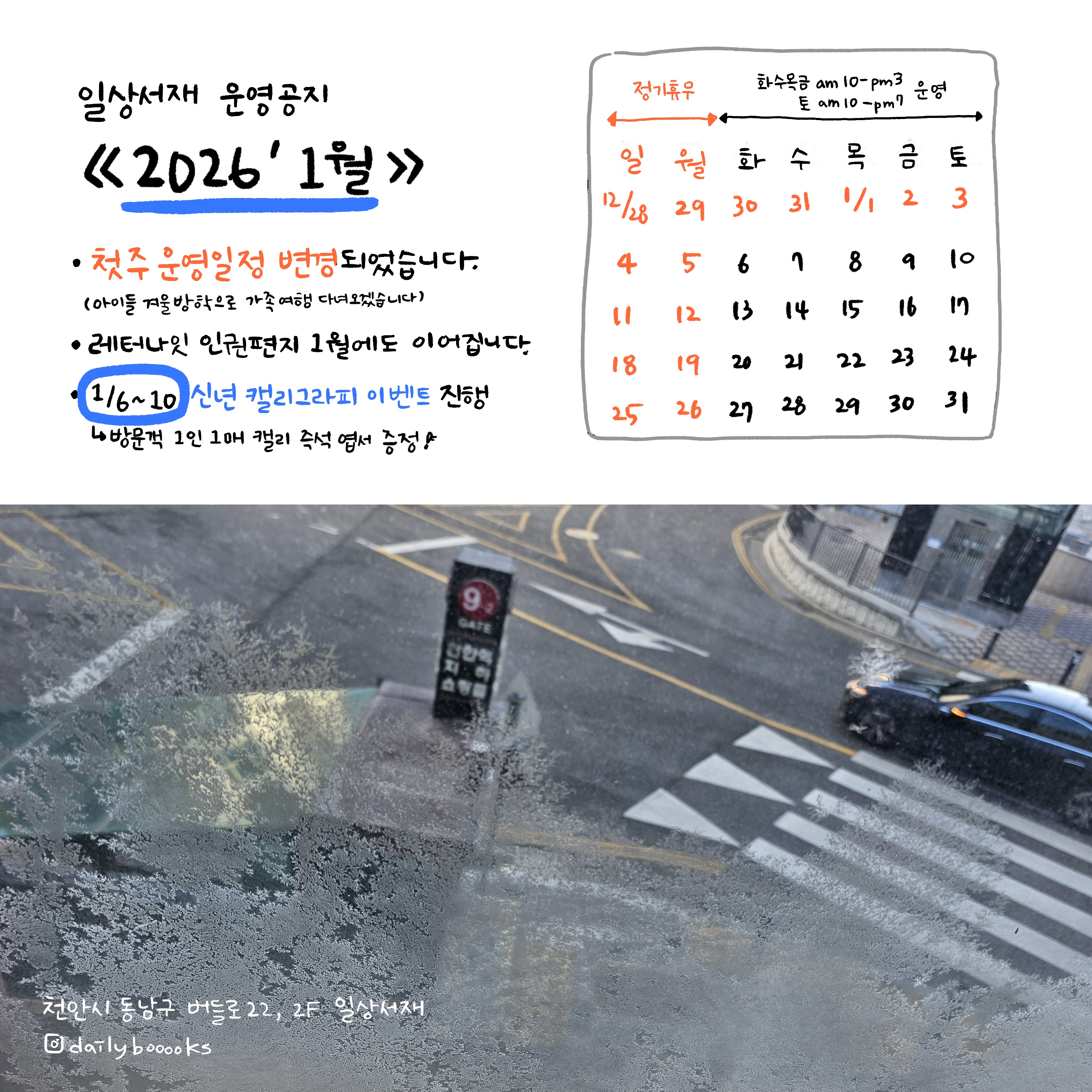 어느덧 책방 창문에 성에가 맺히는 계절이 다가왔답니다.